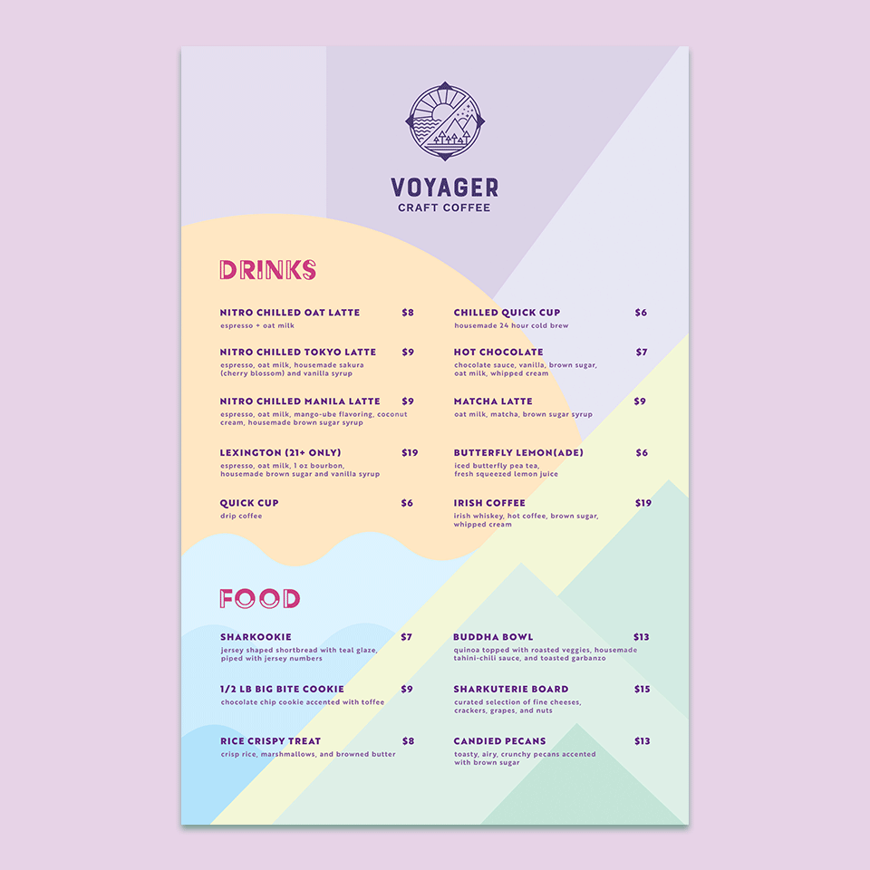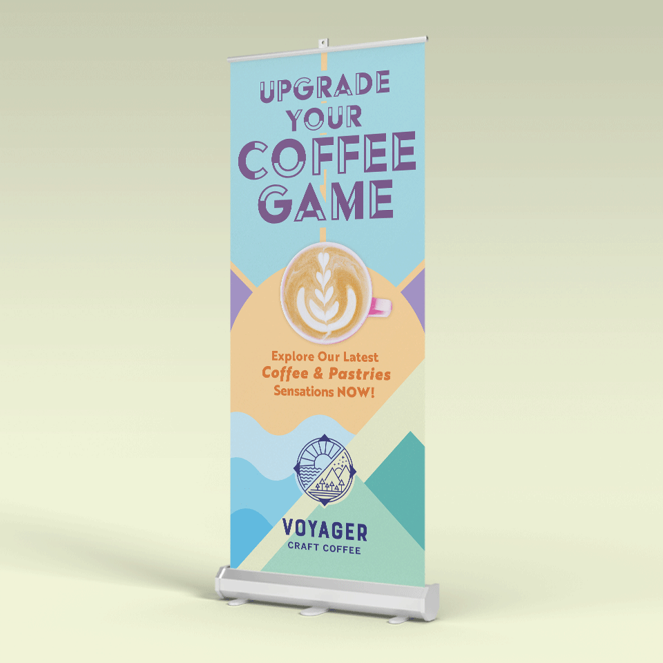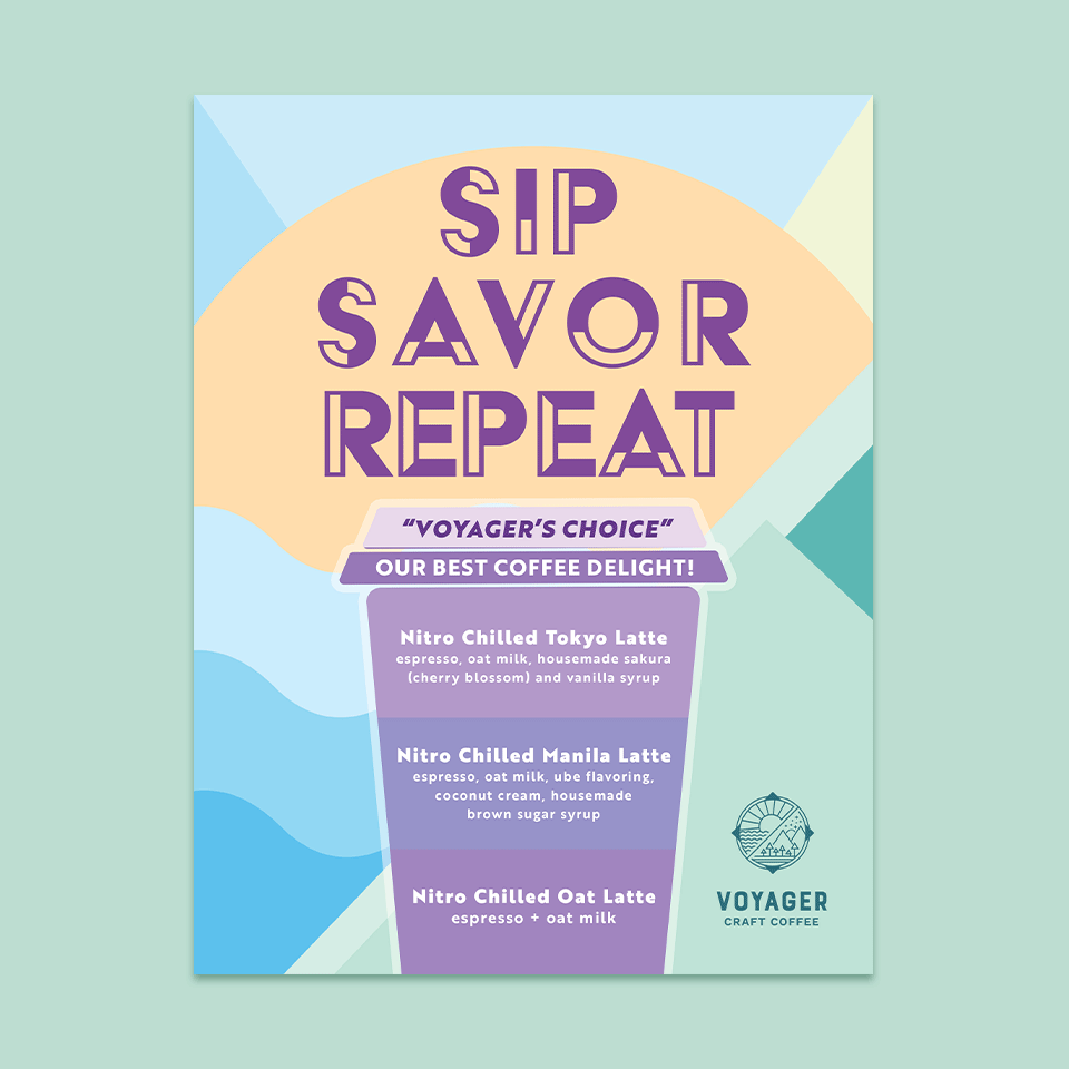 Voyager Craft Coffee is a beloved local brand with multiple locations, each with its own curated aesthetic. When they secured a concession space at the SAP Center, the challenge was to reimagine their branding for a high-traffic, high-visibility environment — one that needed to stand out in a busy arena setting while still feeling true to the Voyager experience. The goal: create a refreshed look that popped in the space, attracted event-goers, and seamlessly tied back to the brand’s established identity.